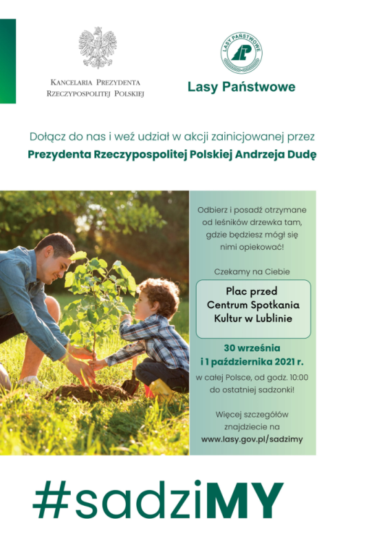 Trzecią edycję społecznej akcji #sadziMY oficjalnie zainaugurują Prezydent Andrzej Duda i Pierwsza Dama Agata Kornhauser-Duda. 1 października Para Prezydencka weźmie udział w sadzeniu drzew w Nadleśnictwie Piotrków, wspólnie z pracownikami administracji publicznej, harcerzami, żołnierzami, strażakami i pracownikami Lasów Państwowych. Na powierzchni ponad 3 ha w Lesie Wolborskim na obrzeżach Piotrkowa Trybunalskiego zasadzone zostaną sosny, buki i jarzęby.